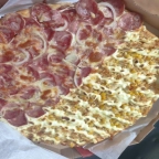Cheddar, Bacon, Catupiry, Calabresa e Mussarela, completa, com tudo o que você tem direito!